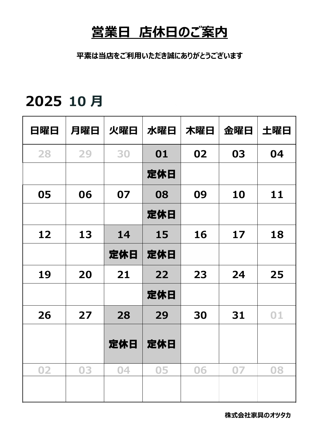 10月の店舗の営業日についてお知らせいたします。