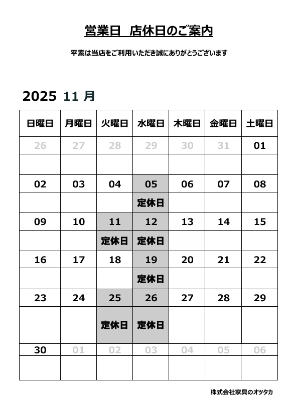 11月の店舗休業日についてお知らせいたします。