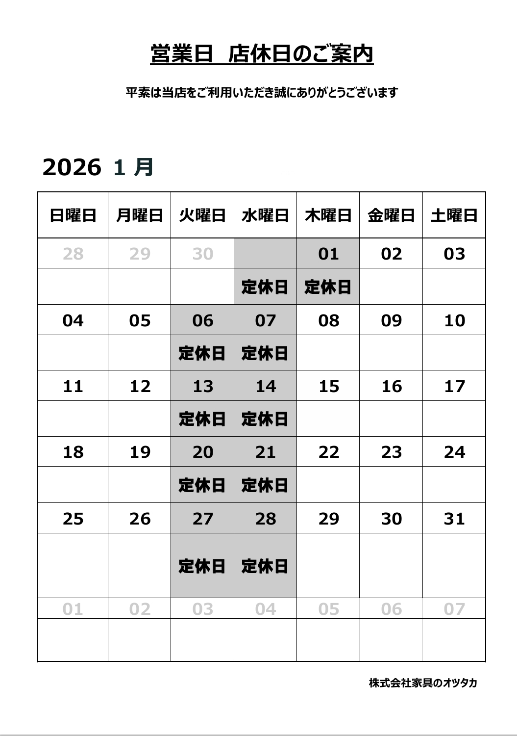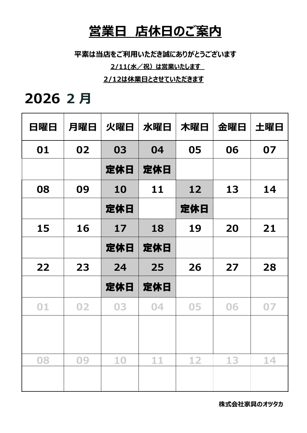 2月の店舗の営業日についてお知らせいたします。今月は祝日と定休日が重なるため、2/11(水)を営業日としております。またその振替休業日として2/12(木)がお休みとなります。ご了承くださいませ。